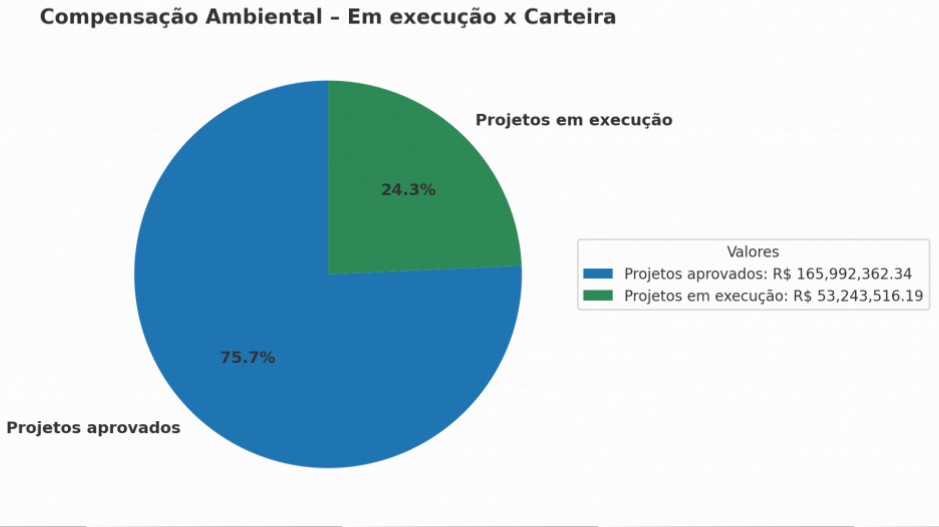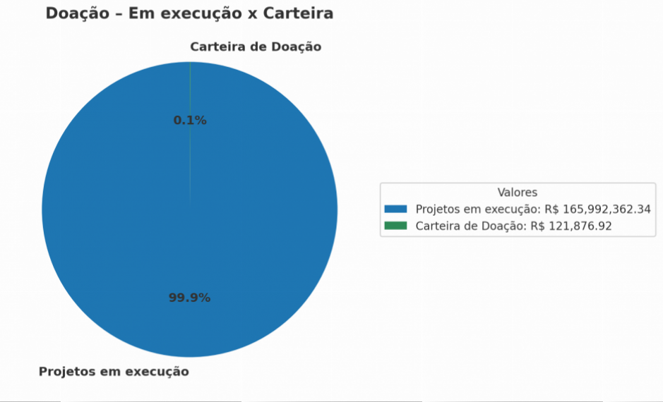 Abaixo apresentamos a relação entre os valores aprovados em carteira e os projetos em execução, permitindo visualizar de forma clara como os recursos estão sendo aplicados em cada área de atuação.